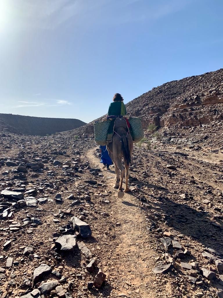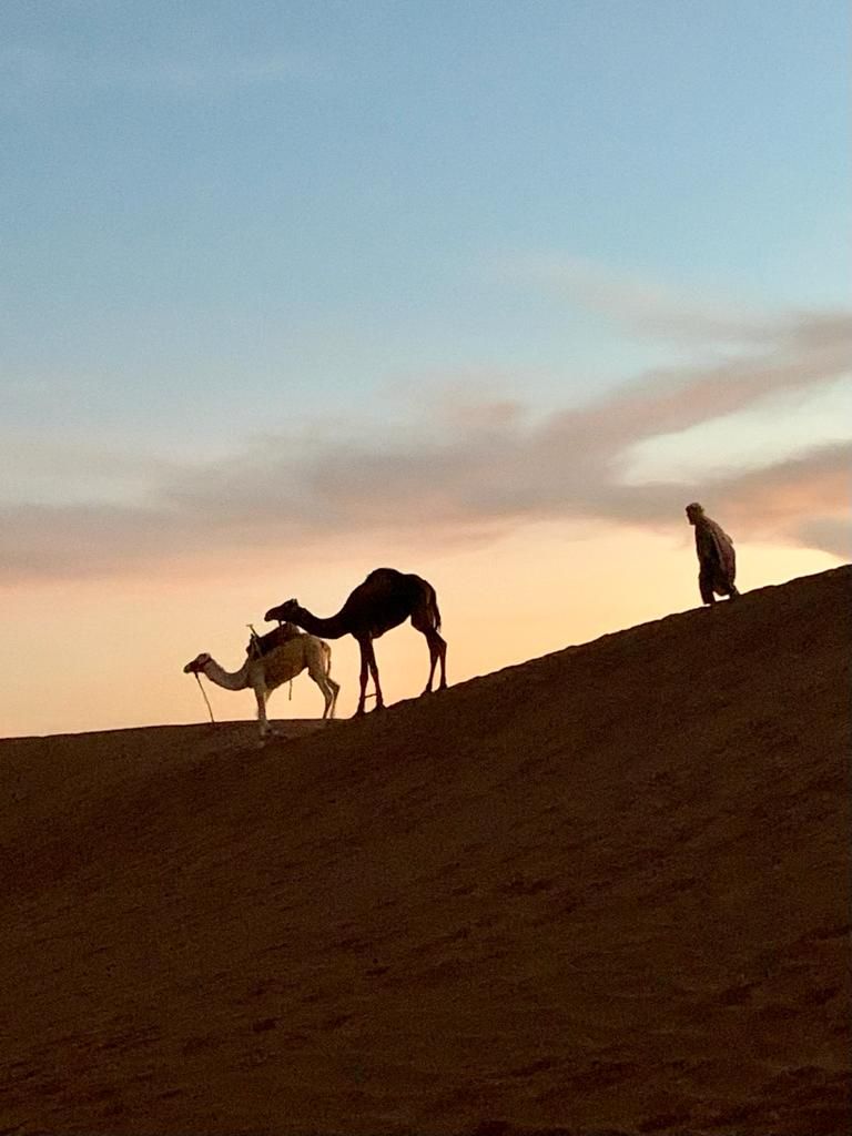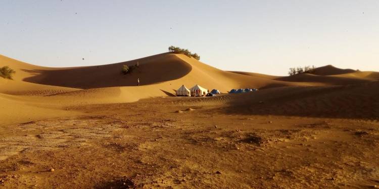 Petit déjeuner, rassemblement du matériel, chargement des dromadaires et vous randonnez sous l’œil attentif des hommes du désert. Vous faites escale dans un campement de nomades avec qui vous pouvez savourer le thé de bienvenue. Ces nomades vivent avec leurs chèvres. Ils font un peu d’artisanat et de commerce. Vous pouvez si vous le souhaitez, échanger avec eux ou/et acquérir quelques objets, éventuellement un chèche si vous n’en avez pas encore. Le chèche est un grand foulard qui vous protège du sable, du vent, de la chaleur et du froid. Vous reprenez la marche tranquille pour 3h environ. Arrivés dans les dunes de Hasi Labid, vous installez votre bivouac auprès de gros tamaris. Vous êtes aux portes du désert. La préparation du déjeuner se fera avec ou sans votre participation, chacun étant libre de vivre son voyage comme il l’entend. Si vous le souhaitez une promenade peut s’organiser l’après-midi. En soirée, L’occasion de faire crépiter un feu de bois n’échappe pas à vos amis chameliers. Avec au dessus de votre tête, la lune, les nombreuses étoiles parfois filantes, vous savourez une envoûtante paix intérieure. Le diner préparé avec application comme toujours vous propose des produits frais et locaux. Peut-être choisissez vous de dormir à la belle étoile ce soir même si comme chaque soir une tente individuelle (ou non, à votre convenance) est à votre disposition.