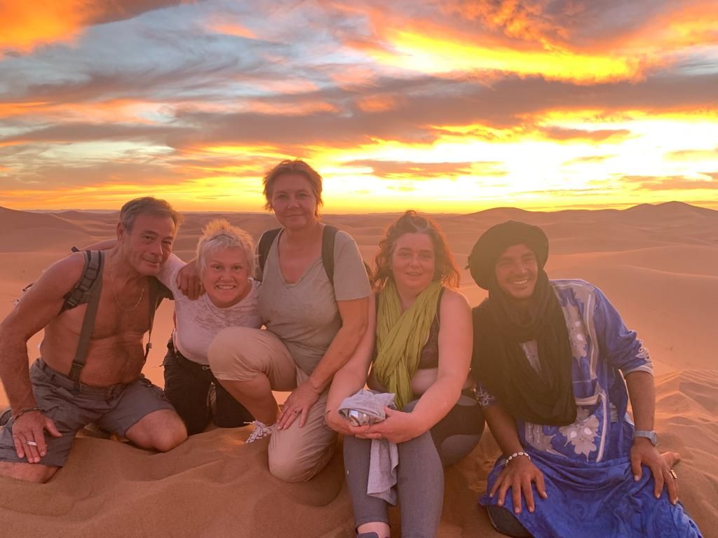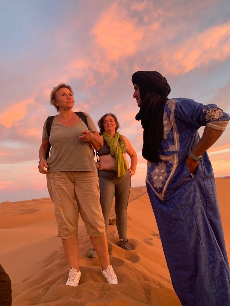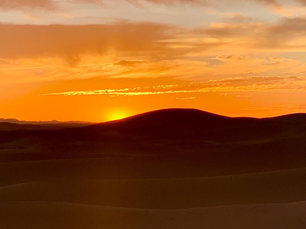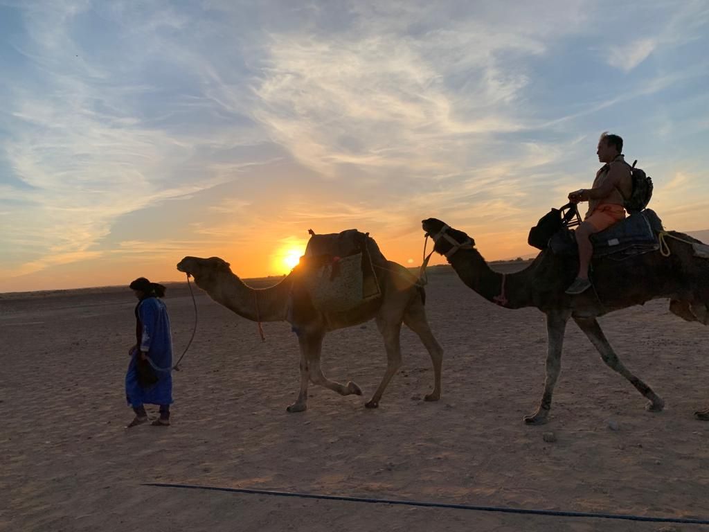 Après un copieux petit déjeuner vous montez à bord d’une auto en compagnie d’Hamid qui vous conduit vers Zagora. C’est l’occasion de traverser de vieux villages, des palmeraies, d’admirer les vues imprenables du Haut Atlas. Avec les pauses, ce trajet dure 4 heures environ. Arrivés à Zagora il est l’heure de déjeuner, un bon restaurant vous attend. Un peu de temps pour fureter ici et là dans la ville puis vous reprenez l’auto pour une petite demi-heure afin d’arriver au camping en dehors de la ville. C’est un bel endroit pittoresque et confortable. Les chambres sont charmantes. Des douches sont à votre disposition. Autour de ce lieu accueillant vous pouvez déjà admirer des petites dunes, approcher les dromadaires et vous émerveiller devant un sublime coucher de soleil. Le diner sera servi au camp, s’en suivra une soirée berbère… Musique, chant autour du feu de bois.