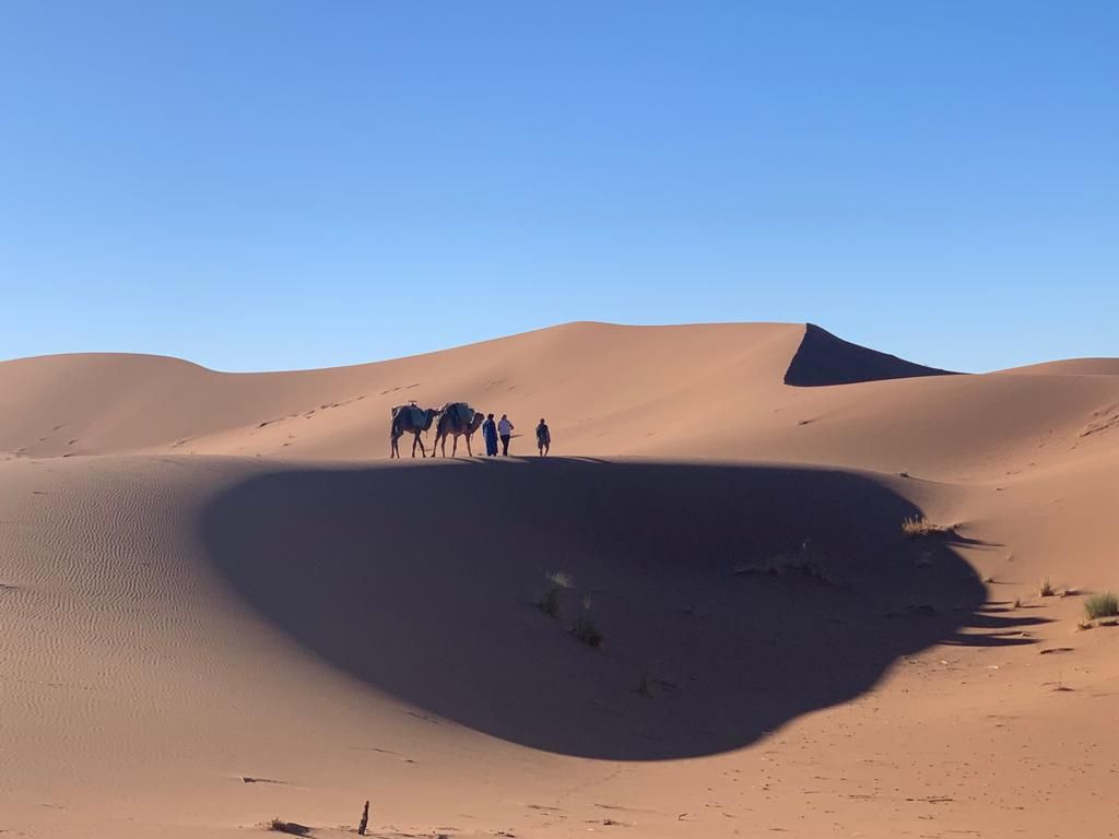 Après le petit déjeuner, rassemblement du matériel et chargement des dromadaires. Vous partez tous ensemble pour trois heures de marche. Des dromadaires de selle sont toujours présents à vos côtés. Si vous ressentez un peu de fatigue, ils vous porteront sans difficulté. Les dunes de Chagaga sont grandes et magnifiques. Vos yeux n’auront de cesse d’admirer ces paysages grandioses. Un silence respectueux s’impose de lui même dans ce lieu magique. Pour ceux qui le souhaitent, il est possible l’après-midi d’accompagner les chameliers au puits non loin de là. Les dromadaires s’y abreuvent et ceux qui désirent se doucher auront accès à l’eau. Retour au bivouac avec la préparation du repas et une soirée tranquille sous la lune lumineuse. Vous restez deux nuits sur ce bivouac car les alentours proposent des décors à découvrir encore et encore. Lors de la préparation des repas, vous pouvez à votre guise assister ou participer et apprendre la cuisine berbère auprès du cuisinier. Vous appréciez votre temps libre, pour vous reposer, lire, échanger, partager. Le deuxième jour dans ce bivouac vous pouvez retourner au puits afin de vous rafraichir.